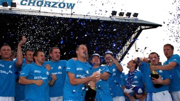 Wiele mówiło się o "wypadku przy pracy" i szybkim powrocie do "elity". Prawda jednak okazała się złośliwa. Pogłębiające się w błyskawicznym tempie długi, rażący brak formy, kłamliwy wizerunek działaczy z Krystianem Rogalą na czele, spowodowały, iż najbardziej utytułowany klub w Polsce musiał zagrać (o zgrozo!) w barażach o utrzymanie się w drugiej lidze. "Niebiescy" dosłownie cudem (!) utrzymali się na zapleczu ekstraklasy. Na ten dramatyczny mecz ze Zniczem Pruszków przyszło 10 tys. ludzi i chyba tylko opatrzność Boża nie spowodowała masowego "herzszlagu", bowiem przy każdym kolejnym zagraniu na ustach każdego kibica słychać było "kur..."! Chyba we wszystkich śląskich kościołach modlono się wtedy o lepsze czasy.