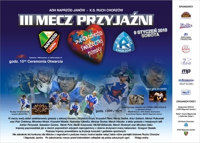 Piłkarze Ruchu Chorzów i hokeiści zaprzyjaźnionego Naprzodu Janów już po raz trzeci zagrają na lodzie dla Wielkiej Orkiestry Świątecznej Pomocy. Zebrane pieniądze trafią oczywiście na konto XVIII finału WOŚP, który poświęcony jest onkologii dziecięcej. - W tym roku Sztab Wielkiej Orkiestry przekazał nam największą w Polsce skarbonkę. Cieszymy się, że Jurek Owsiak docenił nasze starania tymbardziej, iż Ruch rozgrywa przecież swoje mecze z serduszkiem na koszulkach - mówi Bogdan Dittrich, jeden z organizatorów III Meczu Przyjaźni.