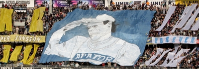 Apator Toruń Po prawie półrocznej przerwie drużyna toruńskich "Aniołów" wróciła na tor żużlowy i w I kolejce Ekstraligi pewnie pokonała wrocławską Spartę 52-38. Na meczu obecnych było około 7.000 widzów, w tym grupa około 100 kibiców gości. "Krzyżacy" zaprezentowali oprawę złożoną z transparentów "Per Jonsson Forever" oraz sektorówki przedstawiającej wizerunek tego zasłużonego, byłego zawodnika Apatora. Całość oprawy uzupełniały żółto-białe pasy materiału. Przed spotkaniem ze Spartą miało miejsce uroczyste otwarcie ulicy imienia Pera Jonssona, na którym nie zabrakło byłego zawodnika toruńskiego klubu. Po blisko trzytygodniowej akcji zachęcającej kibiców Apatora do dopingu bez trąbek wyłoniono zwycięskie hasło - "MotoArena bez trąbienia".