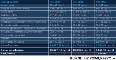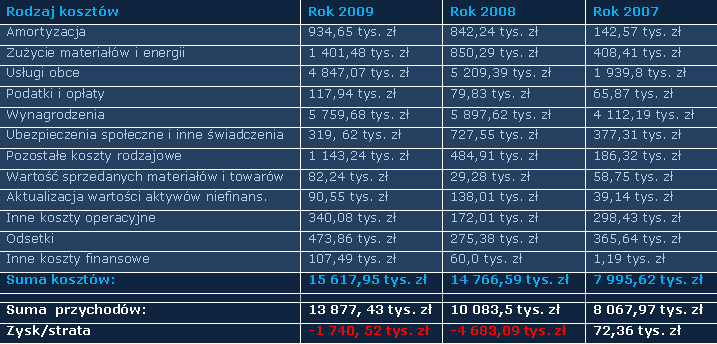 Sprawę kosztów wraz z podziałem na kategorię najlepiej zobrazuje poniższa tabela. Oprócz kosztów zostały w niej zestawione także przychody oraz wynik końcowy za rok 2009, a także dwa poprzednie lata.