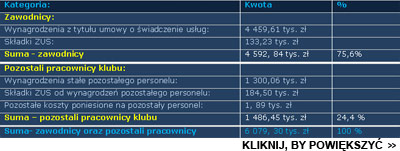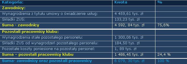 3/4 wynagrodzeń wszystkich pracowników klubu. Raport nie precyzuje dokładnie ile zawodników związanych jest umową o świadczenie usług, czy są to piłkarze wchodzący w skład tylko pierwszej drużyny, czy także Młodej Ekstraklasy. Z raportu możemy się jednak dowiedzieć, że w klubie było zatrudnionych średnio 16 pracowników. Dzieląc zatem sumę kosztów poniesionych na personel przez średnie zatrudnienie oraz 12 m-cy otrzymujemy średni koszt utrzymania pracownika na poziomie