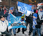 Mimo przeciwności losu postanowiliśmy się jednak dobrze bawić. Podejmowaliśmy różne próby, począwszy od najprostszego "Aleeetic, Aleeetic...", poprzez serię pieśni typowo chorzowskich aż po... "ciuchcię". Ta spotkała się z żywym zainteresowaniem niemieckich kibiców, jak i... służb porządkowych. Wraz z kolejnymi centymetrami padającego śniegu coraz bardziej opadał entuzjazm zarówno nasz, jak i Hiszpanów. Przyczynił się do tego również przebieg wydarzeń na boiskach w Leverkusen i w Salonikach. Także fani Bayeru ani nie zdopingowali nas do bardziej żywiołowej postawy, ani nie zachwycili swoim dopingiem. Nasza "Dziesiona" na przeciętnym meczu wznosi się na wyższy poziom.