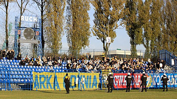 200 osób z dwoma flagami "Arka Gdynia" oraz "Gwardia Koszalin". Ich doping ograniczył się do pojedynczych okrzyków oraz reakcji na słowne zaczepki fanów Ruchu. Jedynie ostatni kwadrans spotkania w wykonaniu fanów Arki to prezentacja w miarę dobrego dopingu, jak na taką liczbę.