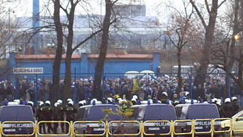 800 osób, ku zaskoczeniu wszystkich a w szczególności policji, przybyli wcześniej niż się ich spodziewano, co sprawiło że niepokojeni przez nikogo sami dotarli pod stadion, a następnie wdzierając się na stadion zajęli sektor gości. Takie zachowanie nie spodobało się ochronie, która spacyfikowała poznaniaków, spychając ich do strefy przejściowej pod sektorem gości, gdzie zostali przetrzymani do rozpoczęcia spotkania. Niestety ten incydent spowodował, że kibice Lecha nie weszli już na sektor gości i kilkanaście minut przed przerwą zostali wyprowadzeni ze stadionu. Kolejny raz inteligencją wykazała się policja, która wyprowadzała fanów "Kolejorza" pod kasami Ruchu, co spowodowało natychmiastową reakcje fanatyków "Niebieskich". Przerodziło się to w awanturę z ochroną. Przez sytuację przedmeczową kibice Lecha nie mieli okazji zaprezentowania się, a mecz został pozbawiony rywalizacji na trybunach, która zapewniłaby dodatkowe emocje podczas spotkania.