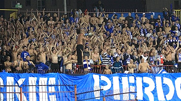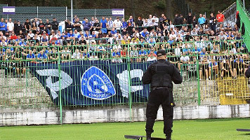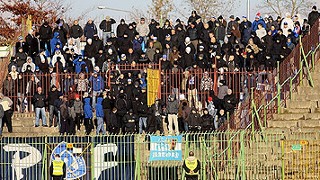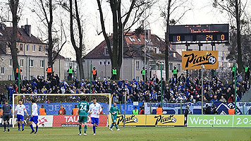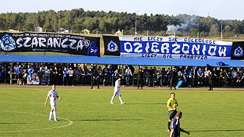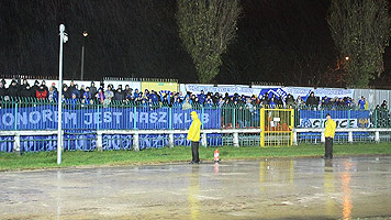 250 fanów "Niebieskich" w tym 20-osobowa delegacja łódzkiego Widzewa. W sektorze gości pojawiła się jedynie flaga "P /R\ F" a wyjazdowy skład - mocno sportowy - ograniczył się do kilku okrzyków.