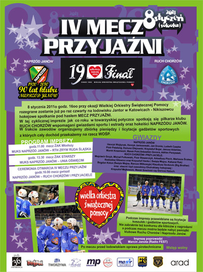 Mecz przyjaźni, rozgrywany przez piłkarzy Ruchu Chorzów oraz hokeistów Naprzodu Janów odbędzie się w najbliższą sobotę już po raz czwarty. Tegoroczna impreza będzie wyjątkowa. - Udało nam się ją połączyć z jubileuszami 90-lecia Naprzodu i Ruchu. Z tej okazji nie zabraknie z nami zawodników, którzy niegdyś stanowili o sile naszego klubu – cieszy się Bogusław Dittrich, jeden z organizatorów imprezy, reprezentujący Naprzód Janów.