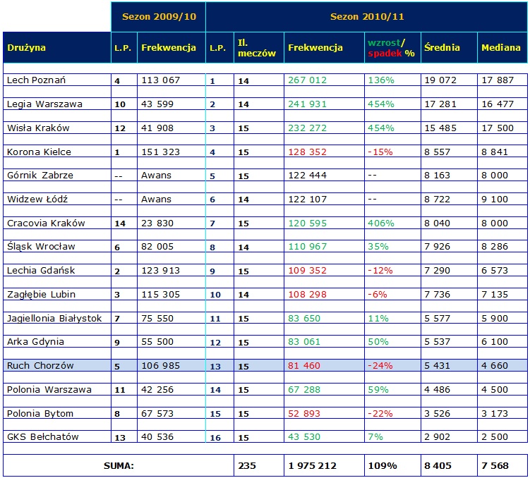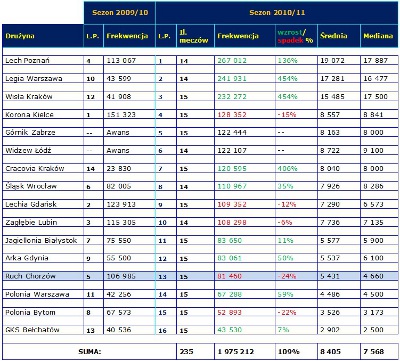 Kliknij, by powiększyćTabela przedstawia frekwencję na meczach Ekstraklasy w sezonach 2009/10 oraz 2010/11 wraz ze średnią oraz medianą. Dane zostały obliczone po zsumowaniu frekwencji podawanych przez Ekstraklasę S.A. po każdej z rozegranych kolejek. Dane procentowe dotyczące wzrostu i spadku frekwencji zostały zaokrąglone.