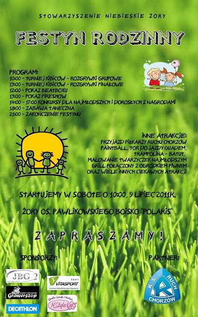 Stowarzyszenie Niebieskie Żory zaprasza na festyn, połączony z turniejem kibiców Ruchu Chorzów, który odbędzie się w sobotę, 9 lipca w Żorach na osiedlu Pawlikowskiego na boisku miejscowego Polarisu.