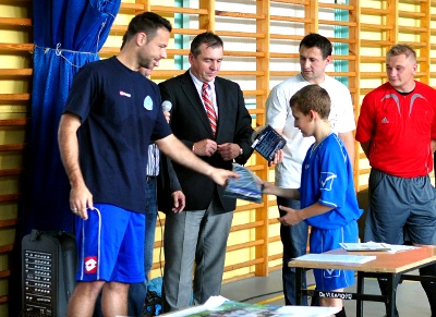 Zawodnicy "Niebieskich", którzy w poniedziałek wzięli udział w otwarciu boiska w Zawierciu, odwiedzili także Liceum Ogólnokształcące im. mjr. Henryka Sucharskiego w Myszkowie, gdzie odbył się I Turniej halowy piłki nożnej uczniów szkół podstawowych, pod patronatem Ruchu Chorzów.