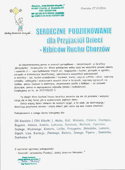 Sympatycy Ruchu na początku września na Społecznym Forum Mieszkańców Chorzowa znaleźli informację o remoncie świetlicy należącej do fundacji "dodaj dzieciom skrzydeł...". Kibice szybko się skrzyknęli i kilka dni później zabrali się do pracy. - Szukaliśmy wolontariuszy, którzy chcieliby nam pomóc. Tymczasem zgłosili się kibice Ruchu Chorzów, którzy przyszli do nas w sile 30 osób! - opowiada prezes fundacji, Iwona Nawrot.