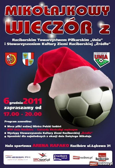 6 grudnia w hali sportowej Arena Rafako w Raciborzu odbędzie się Mikołajkowy Wieczór z udziałem piłkarzy. Główną atrakcją imprezy ma być mecz piłki nożnej pomiędzy mistrzyniami Polski kobiet - RTP Unią Racibórz, a zespołem Gwiazd Ekstraklasy mężczyzn.