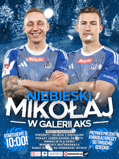 Dominik Preisler i Daniel Szczepan, piłkarze Ruchu, odwiedzą w sobotę Galerię Handlową AKS przy okazji Niebieskich Mikołajek. Wizyta piłkarzy zaplanowana jest między godziną 11:00 a 12:00. Impreza potrwa od 10:00 do 14:00.